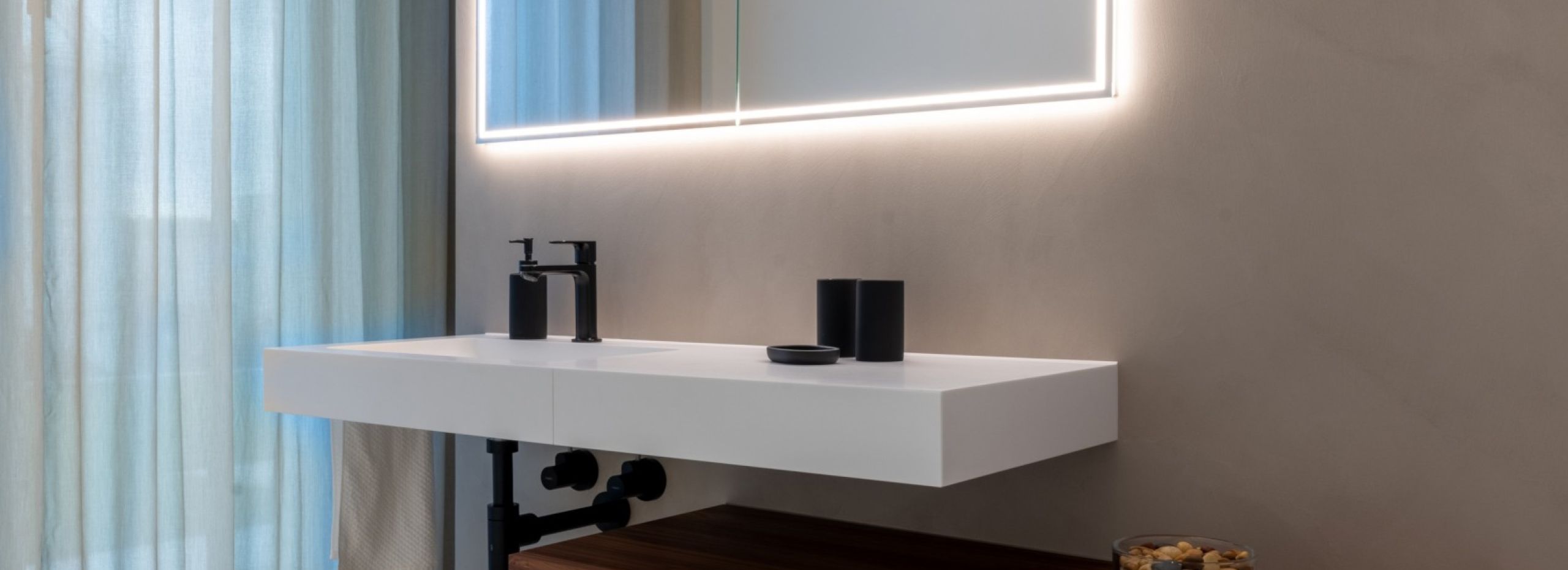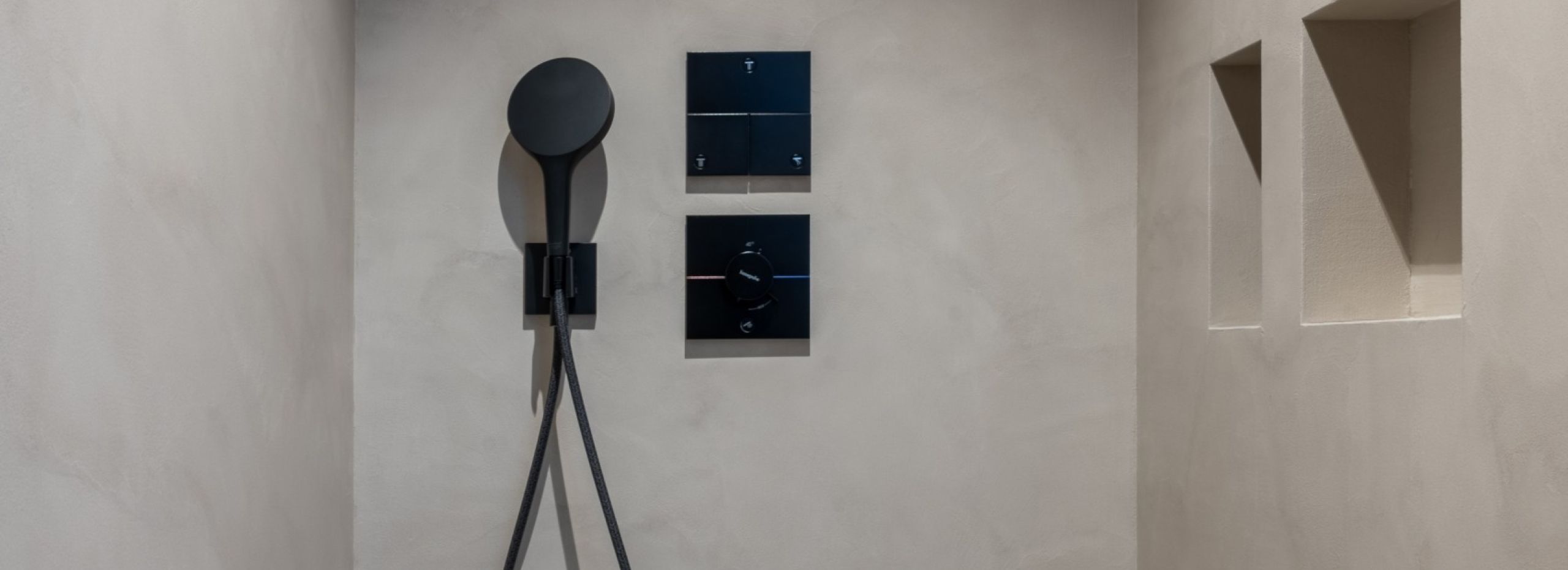 Wir beschichten ein Bad mit fugenlosen Belägen an den Wänden und in der Dusche. Die Nischen in der Dusche sind mit viel Engagment umgesetzt worden.