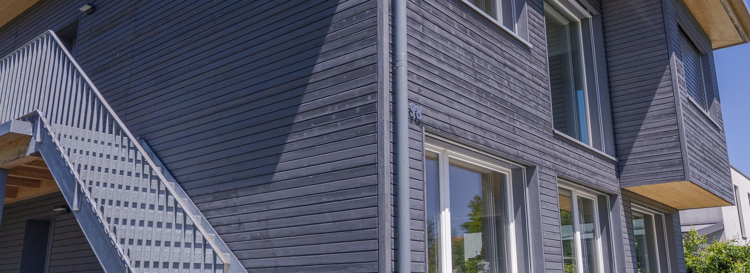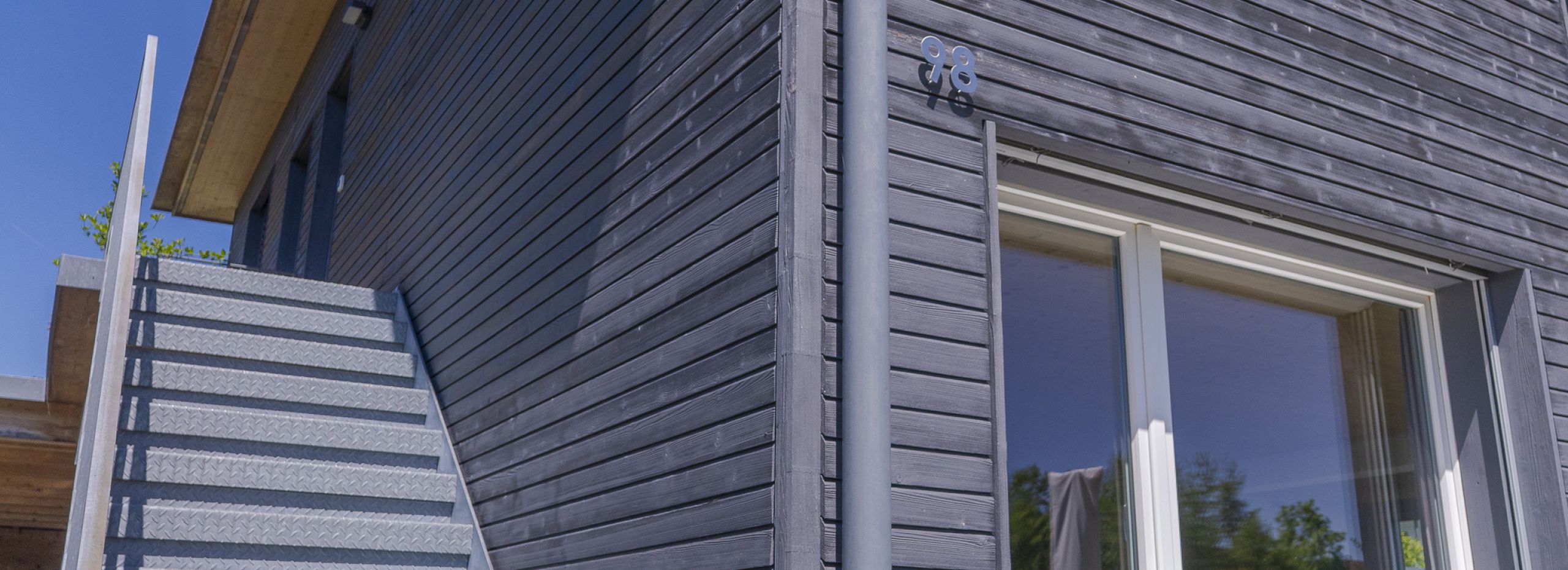 Die dunkle Holzfassade ist mit einem speziellen Anstrich gestrichen worden, somit ist die Fassade langlebeiger.