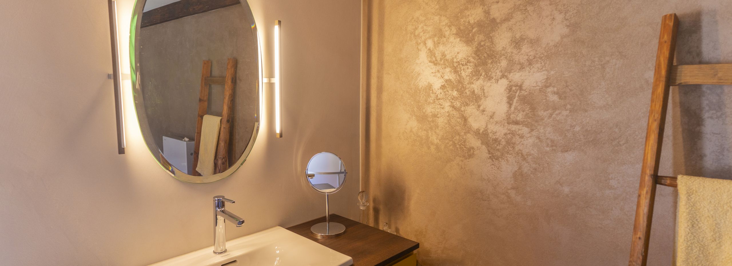 Verschiedene Elemente und Oberflächen werden harmonisch zusammengefügt. Einige Wände werden mit einem metallischer Oberfläche veredelt.