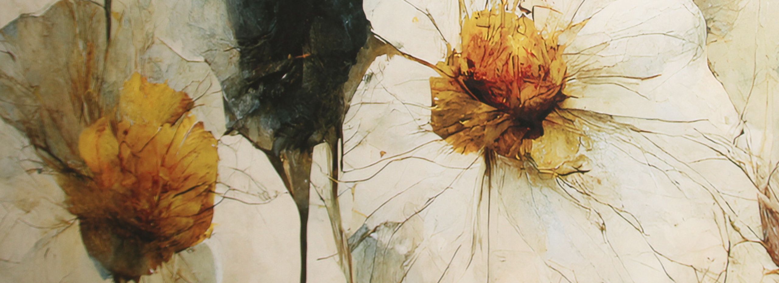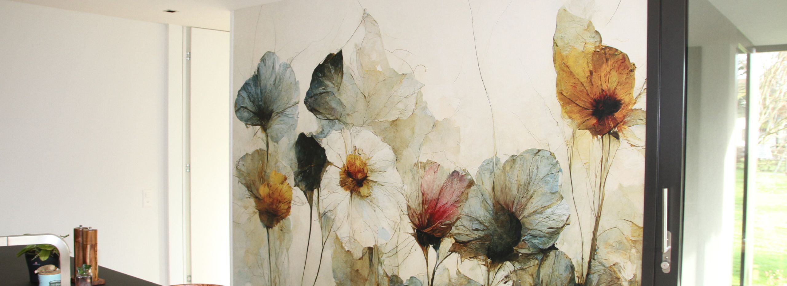 Eine Tapete mit Trockenblumen wird in einer lichtdurchfluteten Küche appliziert und fügt sich harmonisch in die Umgebung ein.